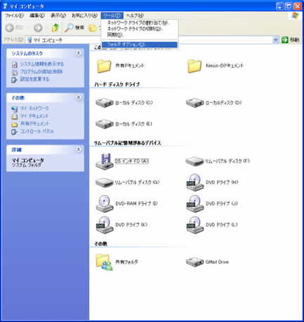 まずマイコンピュータを開いて、ツールというボタンを押して、フォルダオプションを選びます。